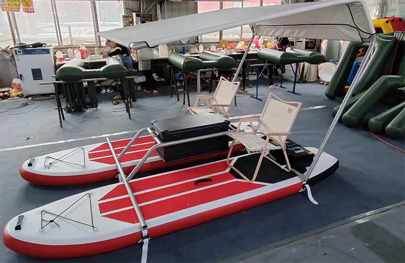 1. Unikalny projekt: - Lekkie materiały PVC Rurka PVC (podkładka druciana) Rada surfingowa z aluminiową ramą lub stalową ramą stalową. Które napędzają stabilność i manewrowalność na wodzie. Ten nadmuchiwany katamaran może usprawnić kształt zmniejsza wodę.